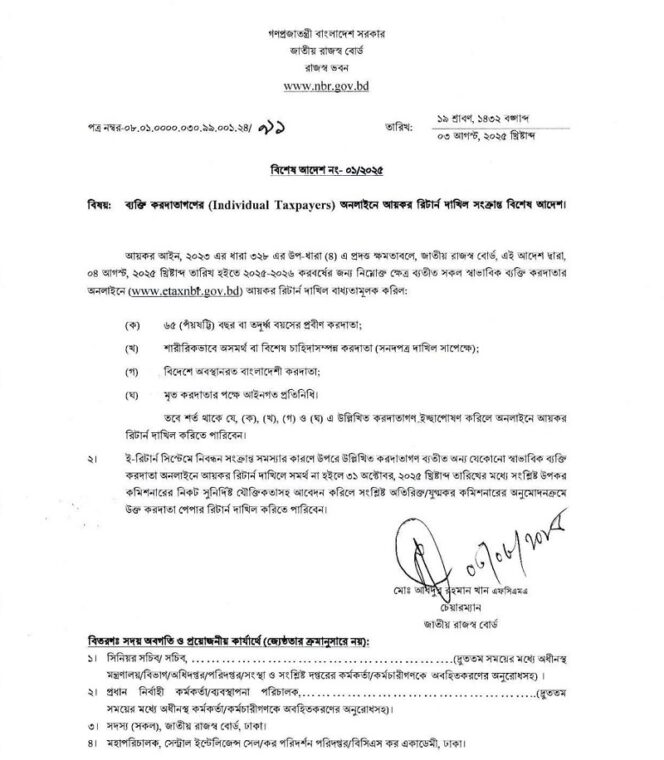 রবিবার এনবিআর চেয়ারম্যান মো. আবদুর রহমান খান স্বাক্ষরিত বিশেষ আদেশে এ নির্দেশনা জারি করা হয়।