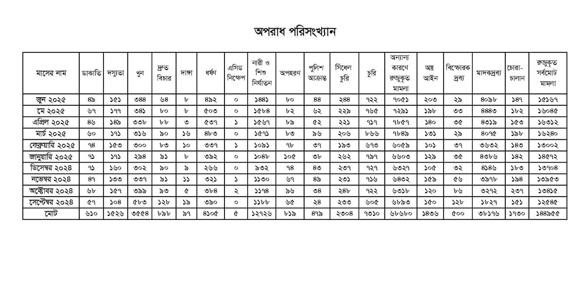 সাম্প্রতিক সময়ে বিভিন্ন গণমাধ্যমে চলতি বছর দেশে অপরাধ বাড়ছে এমন প্রতিবেদন প্রকাশিত হয়েছে, যা সাধারণ মানুষের মধ্যে আতঙ্ক ও নিরাপত্তাহীনতা সৃষ্টি করছে। তবে সেপ্টেম্বর ২০২৪ থেকে জুন ২০২৫ পর্যন্ত সময়ের সরকারি অপরাধ পরিসংখ্যান পর্যালোচনা করে দেখা গেছে, এই আশঙ্কা পুরোপুরি তথ্যনির্ভর নয়। বরং গত ১০ মাসে বড় ধরনের অপরাধের ধারা মোটামুটি স্থিতিশীল ছিল।