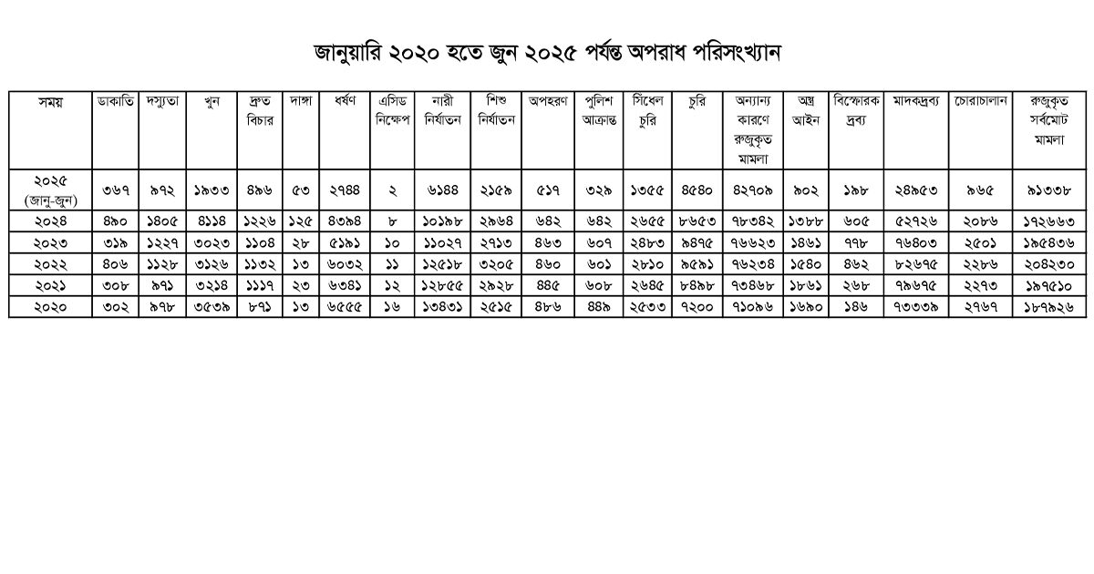 এ বিষয়ে পুলিশ সদর দপ্তরের দেওয়া পরিসংখ্যান অনুযায়ী, গত পাঁচ বছর ও সাম্প্রতিক ১০ মাসের অপরাধ প্রবণতা সংক্রান্ত দুটি পৃথক টেবিল প্রকাশ করা হয়েছে। সব তথ্যই এসেছে পুলিশের নিজস্ব রেকর্ড থেকে।