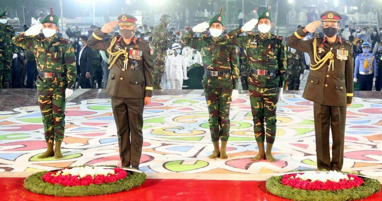 President’s Military Secretary Major General SM Salahuddin Islam was the first to lay the wreath at the Central Shaheed Minar. Just after him, Prime Minister’s Military Secretary Major General Naquib Ahmed Chowdhury placed the wreath at the Shaheed Minar.