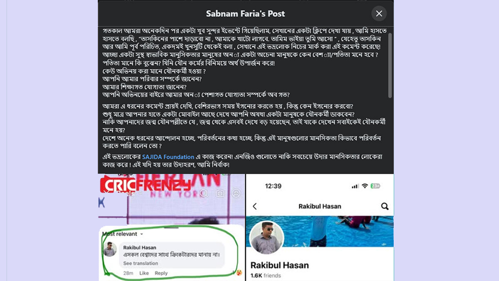 যেখানে সেই যুবকের কমেন্টের স্ক্রিনশট ও ফেসবুক প্রোফাইলের ছবি তুলে ধরে অভিনেত্রী লিখেছেন, গতকাল আমরা অনেকদিন পর একটা খুব সুন্দর ইভেন্টে গিয়েছিলাম। সেখানের একটা ক্লিপে দেখা যায়, আমি হাসতে হাসতে বলছি, ‘তাসকিনের পাশে দাড়াব না, আমাকে খাটো লাগবে। তামিম ভাইয়া তুমি আসো।’ যেহেতু তাসকিন আর আমি পূর্ব পরিচিত, একদমই খুঁনসুটি থেকেই বলা, সেখানে এই ভদ্রলোক নিচের মার্ক করা এই কমেন্ট করেছে!