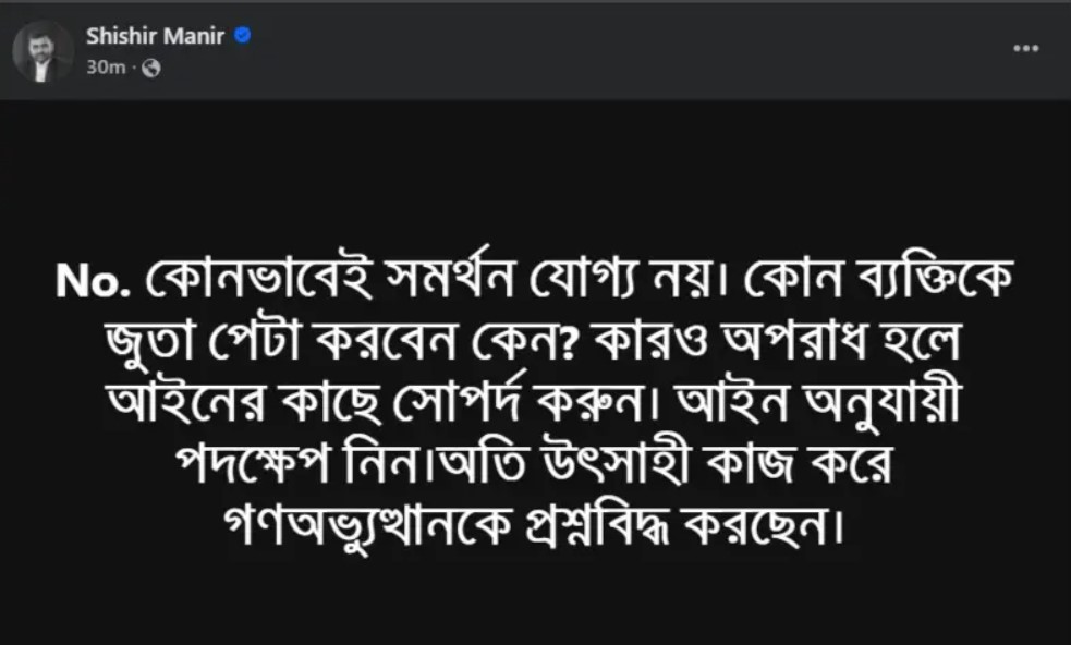 সোমবার (২৩ জুন) নিজের ব্যক্তিগত ফেসবুক অ্যাকাউন্টে দেওয়া এক পোস্টে তিনি লেখেন: “No. কোনভাবেই সমর্থনযোগ্য নয়। কোন ব্যক্তিকে জুতা পেটা করবেন কেন? কারও অপরাধ হলে আইনের কাছে সোপর্দ করুন। আইন অনুযায়ী পদক্ষেপ নিন। অতি উৎসাহী কাজ করে গণঅভ্যুত্থানকে প্রশ্নবিদ্ধ করছেন।”