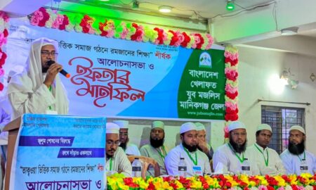মানিকগঞ্জ প্রতিনিধি : মানিকগঞ্জে বাংলাদেশ খেলাফত যুব মজলিসের জেলা শাখার উদ্যোগে ‘তাকওয়া অর্জনে মাহে রমজানের ভূমিকা শীর্ষক’ আলোচনাসভা ও ইফতার…