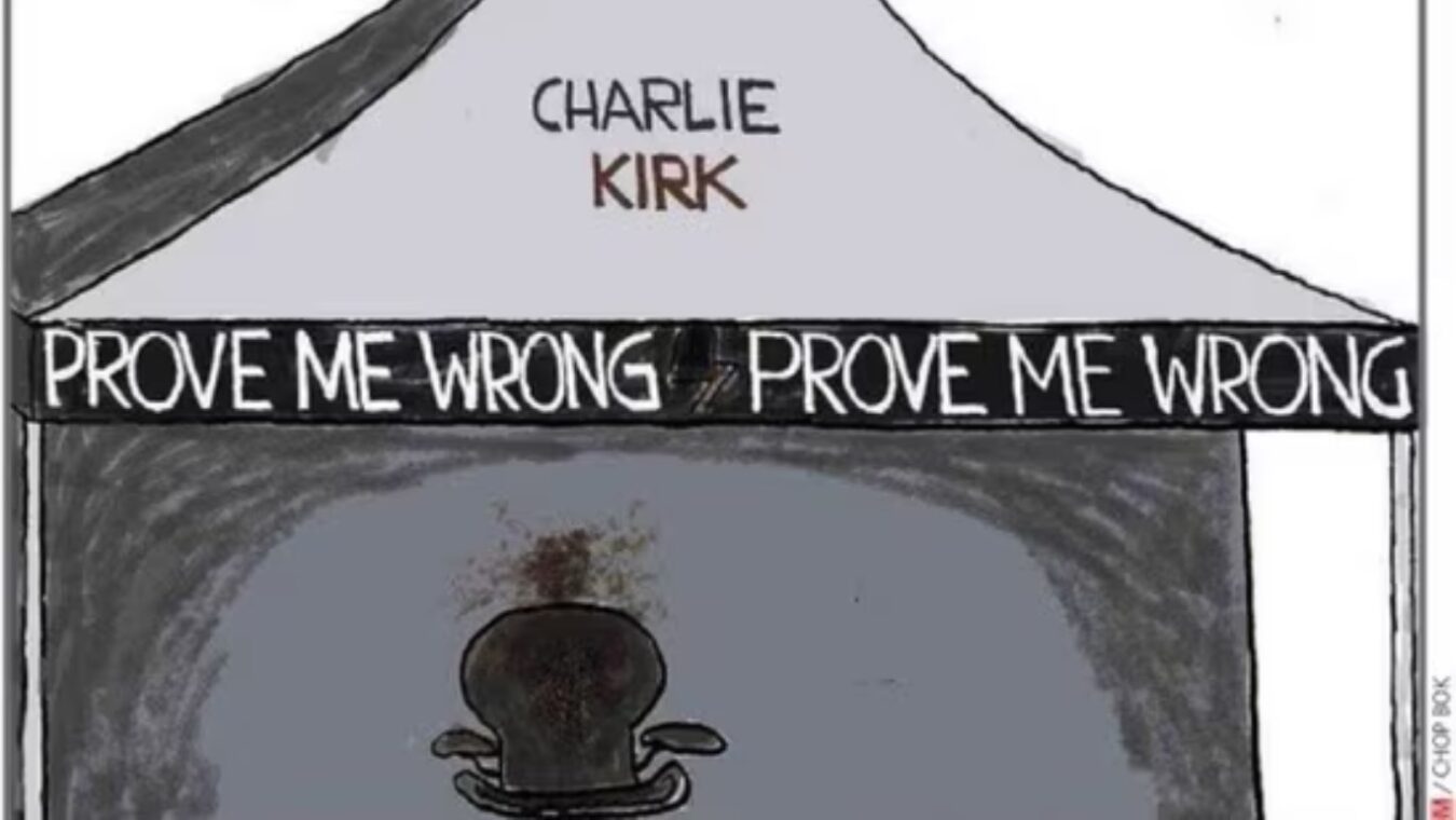 The cartoon showed an empty chair with blood and a label linked to Turning Point USA. Critics called it “insensitive.”